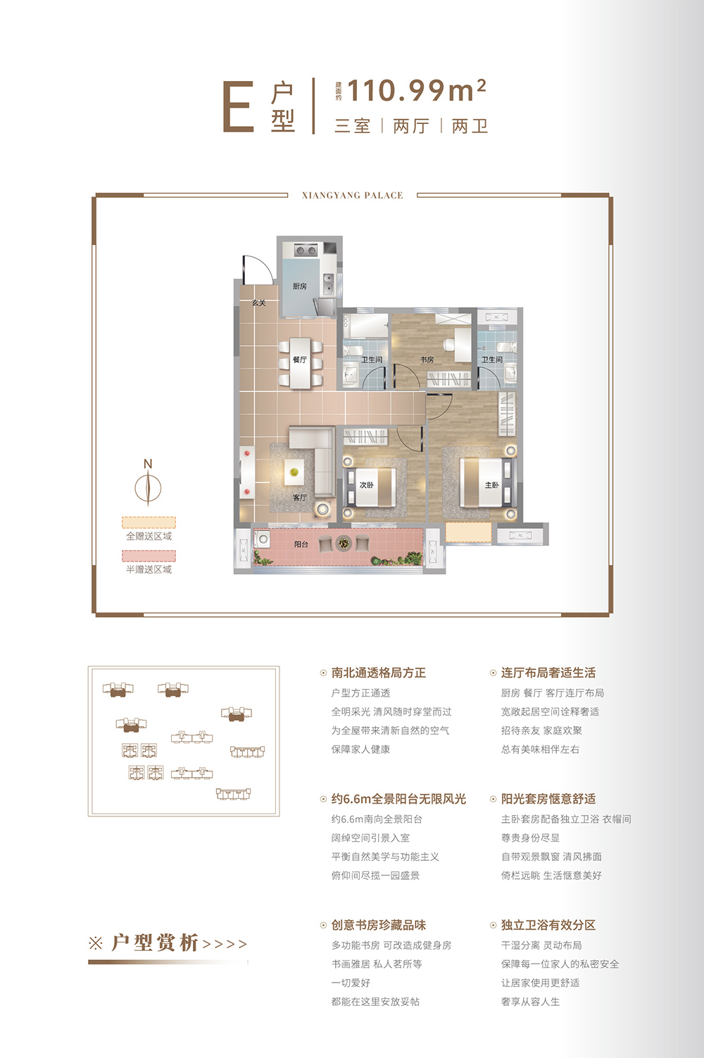 南北通透方正格局 / 南向阳台尽享绿意 / 轩昂宽厅格局奢阔 / 奢阔套房人生无限 / 餐厨一体融贯中西 / 独立卫浴有效区分